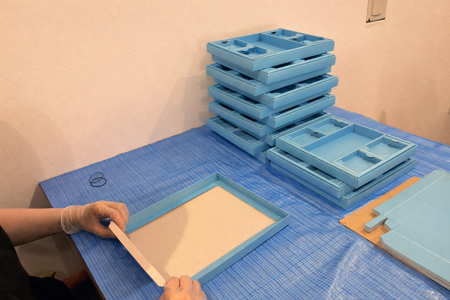allesliebeでは、ギフト用の貼り箱や台紙の組み立て作業を行っています。ノルマや厳しい納期はなく、一人ひとりの体調やペースを大切にしながら取り組める作業です。箱が少しずつ形になっていく工程を楽しみながら、「できた」という達成感を積み重ねていきます。職員がそばでサポートするため、初めての方でも安心して参加できます。