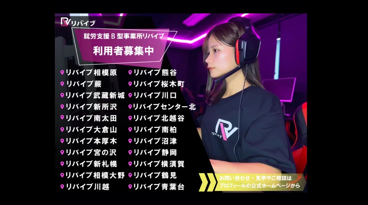 リバイブ北越谷はどんな事業所なの?この事業所は就労継続支援B型です。 働くことに障害のある方がサポートを受けながら仕事や日中活動が出来ます。リバイブ北越谷の特徴オンライン面談空きあり集団支援個別支援個別カリキュラムピアサポートリモート可IT特化送迎あり昼食あり事業所からのメッセージリバイブで新たな可能性を広げてみませんか? リバイブはeスポーツと動画編集をプロから学べる就労支援B型事業所です。 初心者の方でも安心して学ぶことができるオリジナル教材カリキュラムをご用意しているので、着実にスキルアップしていくことが可能です。 週1日1時間からのご利用も可能なので、ご自身のペースで通うことができます。 リバイブで過去の限界を超えて新たな未来を切り開いてみませんか? スタッフ一同心よりお待ちしております支援内容について確認したい