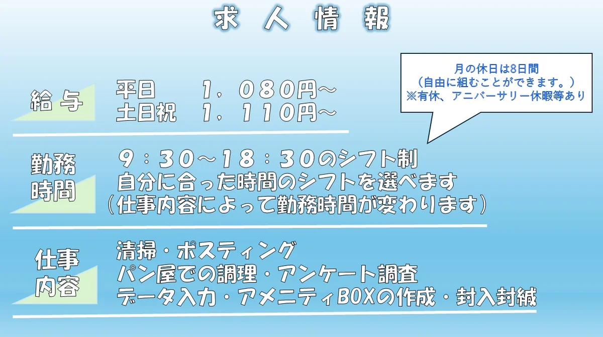障がいの有無にかかわらず、誰もがさまざまな仕事に挑戦し、自分の目標に向かって成長するための就労継続支援A型事業所です! シフト制ならではの、休日や出勤時間なども自分の体調に合わせて調整することができる自由度の高い事業所になっています! また、多岐に渡る業務内容の中で、様々な仕事を幅広く経験できます! 評価制度やステップアップ制度(リーダー、準社員、正社員)、精勤手当、スタンプカード制度などの福利厚生も充実してます! 仕事を通してやりがいや日々の楽しさを見つけ、あなたらしく働ける環境です!