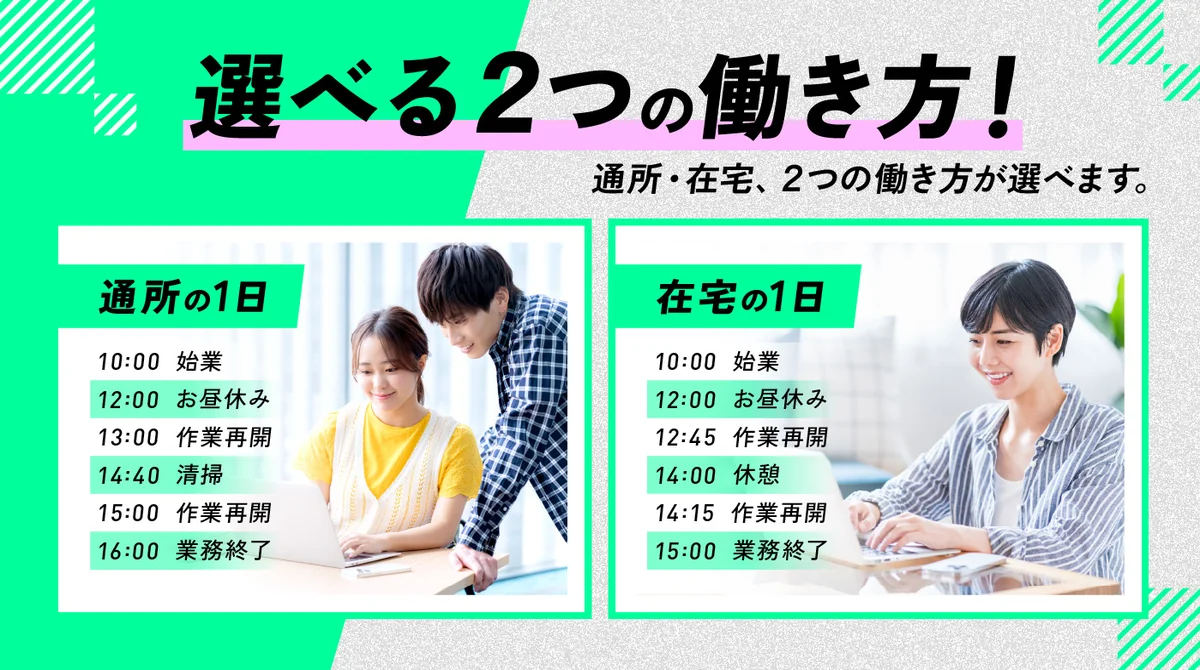 在宅ワークやフレックス勤務も可能ですので、自身の体調や自分にあったペースでお仕事をする事ができます。