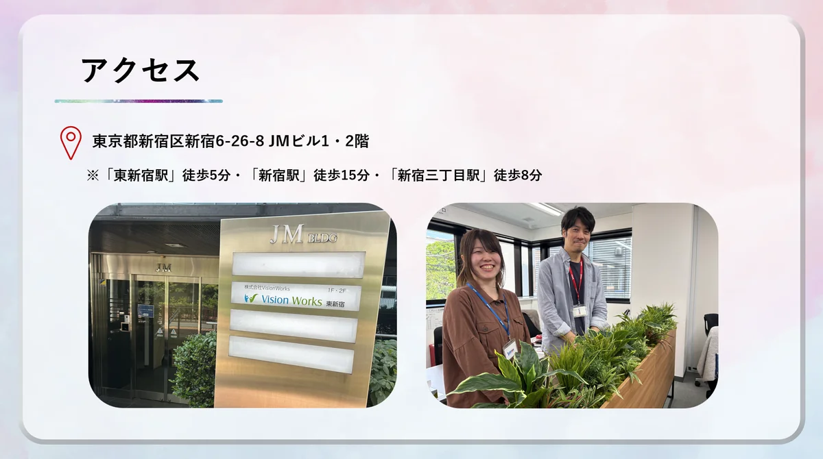 2024年12月に設立された株式会社 VisionWorksが運営しており、 障がい者雇用を通じて人と社会をつなぐ架け橋となることを目指しています! 「“自分らしく”を大切に。その一歩が、社会を豊かにする。」という理念のもと、 一人ひとりの可能性を信じ、未来に向けて全力でサポートしています😊 また、東証プライム上場企業である株式会社ビジョンのグループ会社であり、 安心して働ける環境が整っています🎵! 【利用料に関して】 VisionWorks 東新宿では利用料は全額免除となります。 通常は就労移行支援制度の利用期間中の利用料金は厚生労働省によって定められており、9割を区市町村が補助金で負担し、1割を利用者が就労移行支援事業所に支払います。