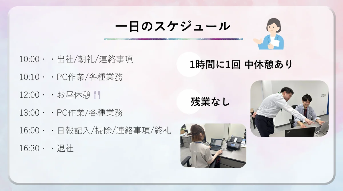 PCを使用した業務がメインとなりますので、PCスキルの向上が見込めます。