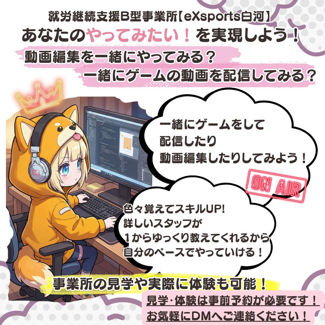 福島県初!eスポーツ特化のB型事業所。白河駅徒歩圏内で、ゲーム制作・動画編集など最新のPCスキルを身につけながら、楽しく自分らしい社会参加を一歩ずつ目指せます。