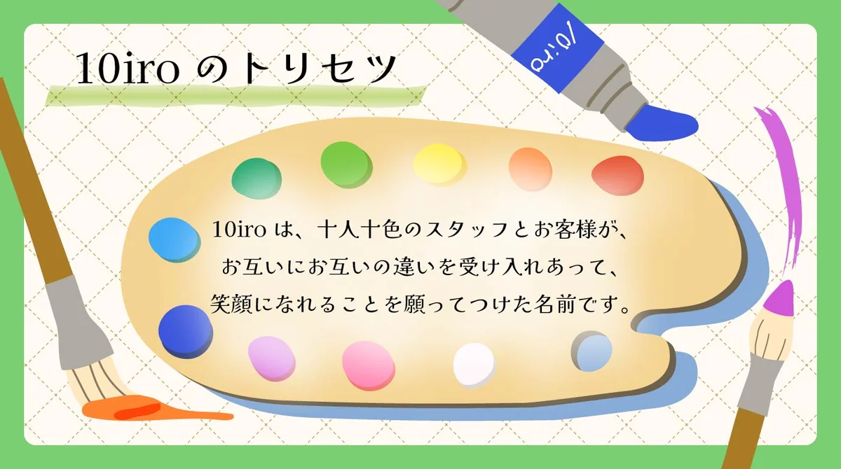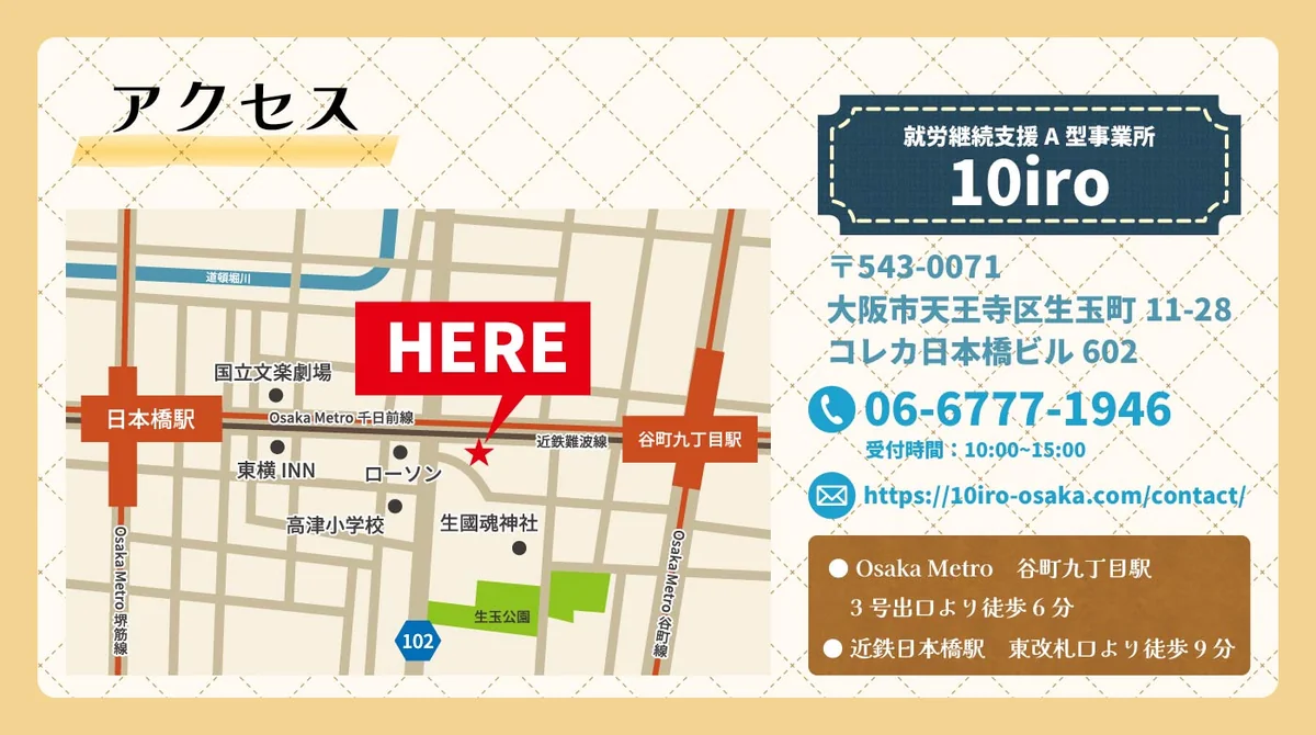 10iroは、大阪市天王寺区にあり、最寄りの大阪メトロ谷町線・千日前線「谷町九丁目駅」3番出口から西へ徒歩5分、近鉄大阪線・近鉄奈良線「大阪上本町駅」から西へ徒歩8分の好立地にあります。 当事業所では、ハンドメイド製品の制作やECサイトの運営、SNSの管理など、多岐にわたる業務を提供し、利用者の方々が自身の適性や興味に応じてスキルを磨くことができます。 また、職業訓練や就労支援を通じて、技術と体力の向上を図り、一般就労を目指す方々の社会進出と自己実現をサポートしています。見学や体験入所も随時受け付けており、利用者一人ひとりのニーズに合わせた支援を行っています。