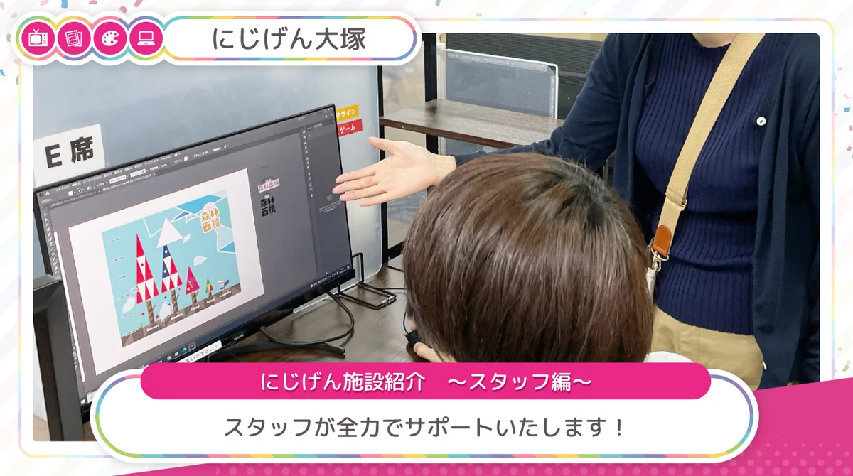 にじげん大塚での具体的な仕事内容POINT 1にじげんとは?にじげんでは、ご利用者様の興味あるジャンルを楽しく学びながらスキルを身につけるサポートを行っています。 自信がなくても大丈夫!まずはやってみたいことを教えてください。 スタッフがその夢の実現に向け、キャリア相談、機材の準備、学習指導、学習教材の提供等、幅広くサポートします! 既にスキルをお持ちの方も、未経験だけどやってみたい!という方も、自分のペースで楽しみながらチャレンジしてみませんか?POINT 2有名クリエイターが提携&応援♪にじげんでは、プロの漫画家やイラストレーターによるオンライン講義やトークイベントを開催しています! 毎月1回以上の漫画家による定期講義に加え、年に数回のスペシャルイベントも実施。 全事業所オンラインで一斉配信されるため、お近くの通いやすい施設で、気軽にプロの授業を受けられます♪仕事内容を確認したい