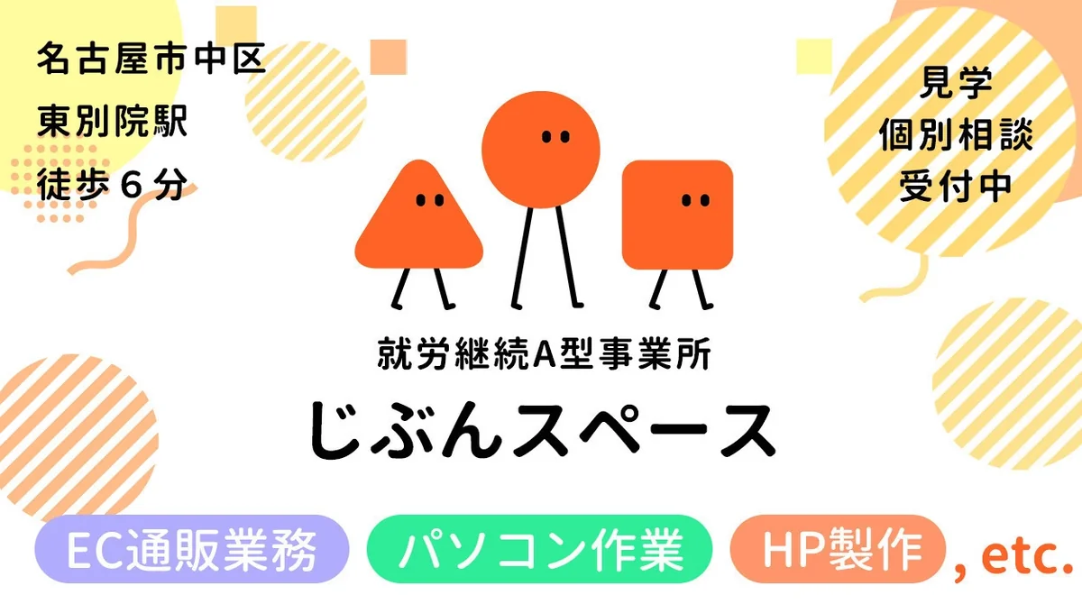 《じぶんスペースについて》 じぶんスペースは名古屋市中区(東別院駅から徒歩6分)にあるA型事業所です。 利用者の皆様には、IT関係業務(パソコン作業)を中心とした作業をお願いしており、将来的な一般就労を見据えた支援を行っております。 《じぶんスペースのおすすめポイント》 ✨ 高時給スタート 時給1,170円〜。安定した収入を目指せます。 ✨ アクセス良好 駅やバス停からすぐ。金山駅からも徒歩圏内で通いやすい環境です。 ✨ 自分のペースで働ける 一人で集中できる作業も多数。あなたの特性や希望に合わせた働き方を一緒に見つけます。 ※平日は週5日通所が必要です。 ✨ 資格取得を応援 働きながら、就職に有利な資格取得をサポートします。 ✨ 見学歓迎 毎日1名以上が見学中!関心を持っていただける方が増えています。 《じぶんに合ったお仕事が見つかります》 【データ入力・情報収集】 指定データの収集・調査を行ったり、集めたデータの入力などを行います。 パソコンの基本的な操作スキルからエクセルやワードなど事務職で活用できるスキルを磨けます。 【通販の梱包作業】 袋詰めやシール貼りなどの軽作業。コツコツ作業が好きな方におすすめ。 またお客様への商品発送の準備作業にもご対応いただきます。 【動画編集】 撮影動画を元に、字幕の文字起こし・効果音付けの作業を行います。 編集ソフトの知識やユーザーに見やすい動画の作り方を学ぶことができます。 【その他】 ライティング、Webサイト制作、SNS運営など、幅広い業務があります。 ※一部専門スキルが必要な場合もあります。 《一般就労へのサポート》 【履歴書・面接対策】 ・実務経験を活かしたアピール支援 ・就職活動の付き添いや関係機関との連携 「どんな企業で働きたいか」「どんなスキルを伸ばしたいか」などを一緒に考えながら、一般就労を目指します。 【あなたのペースを大切に】 ・常に職員に相談できる安心サポート体制 ・作業環境の調整(耳栓・イヤホンの使用なども可能) 快適に働けるよう、一人ひとりに合った環境づくりを行っています。 《👉 見学・ご相談は随時受付中!》 平日の午前・午後で受け付けております。お気軽にお問い合わせください。