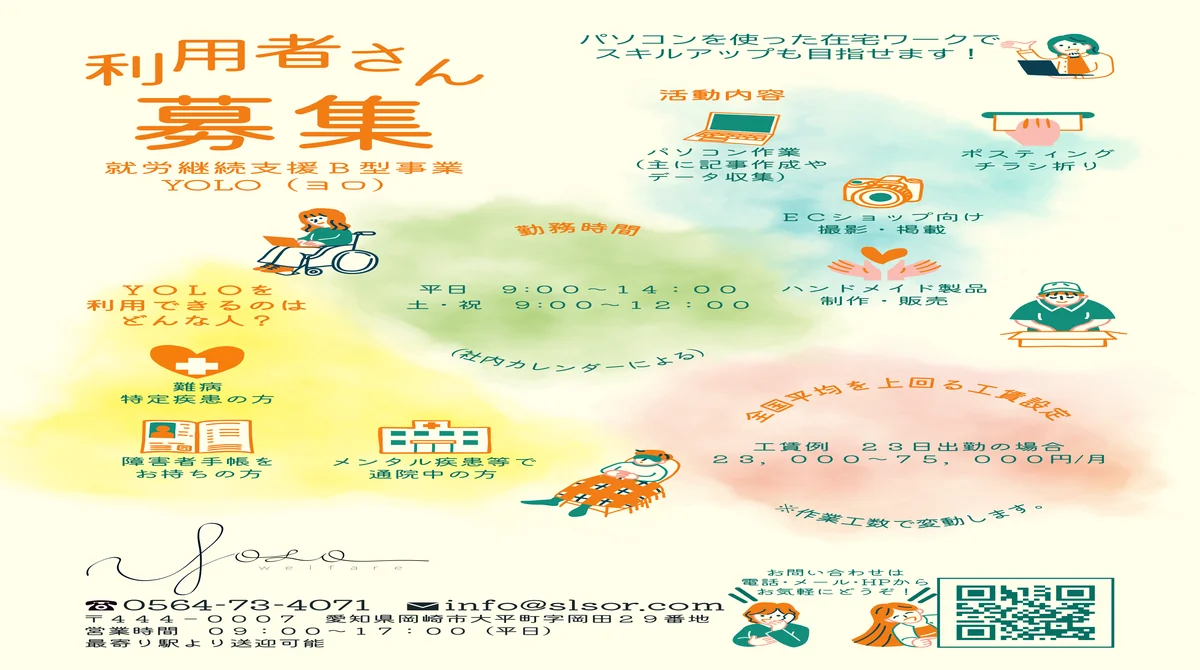 パソコンを使った在宅ワークで外出できない方も就労参加ができる事業所です。愛知・岐阜・三重を中心に全国の方を募集しています。PC未経験の方も大歓迎、在宅就労での収入源を考えている方お問い合わせください。