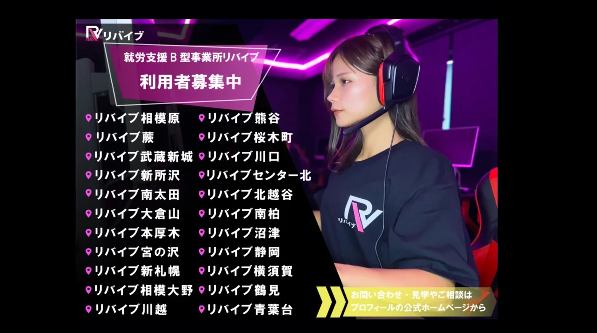 リバイブ関内桜木町はどんな事業所なの?この事業所は就労継続支援B型です。 働くことに障害のある方がサポートを受けながら仕事や日中活動が出来ます。リバイブ関内桜木町の特徴オンライン面談空きあり集団支援個別支援個別カリキュラムピアサポートリモート可IT特化送迎あり昼食あり事業所からのメッセージリバイブで新たな可能性を広げてみませんか? リバイブはeスポーツと動画編集をプロから学べる就労支援B型事業所です。 初心者の方でも安心して学ぶことができるオリジナル教材カリキュラムをご用意しているので、着実にスキルアップしていくことが可能です。 週1日1時間からのご利用も可能なので、ご自身のペースで通うことができます。 リバイブで過去の限界を超えて新たな未来を切り開いてみませんか? スタッフ一同心よりお待ちしております支援内容について確認したい