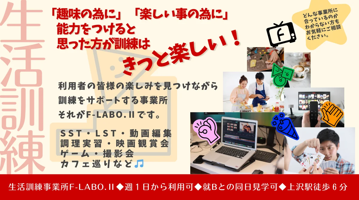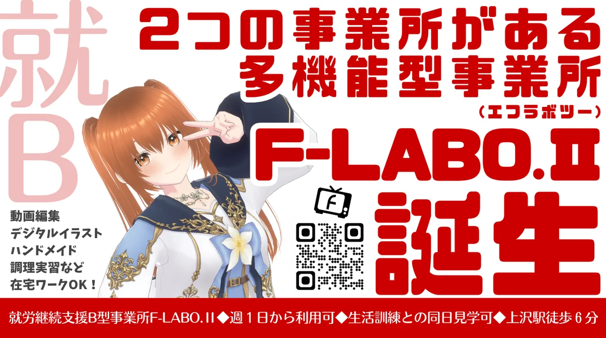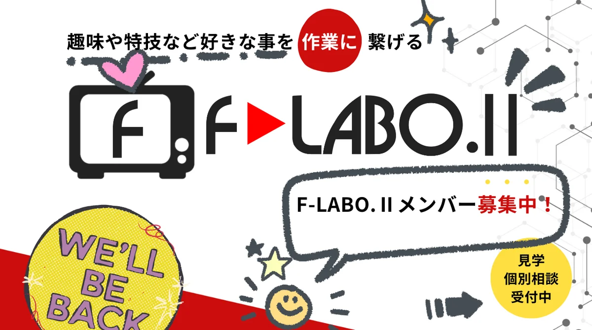 F-LABO.Ⅱでは映像制作や動画編集を中心に行っており、興味のある分野を仕事とすることで、楽しみながらステップアップのための「技術」や「知識」を獲得することを目的としています。 動画編集やPCにあまり触れたことが無い方でも、Youtube等で動画を見るのが好きな方はお気軽にお問い合わせください。それぞれのペースで一からサポートさせていただきます。