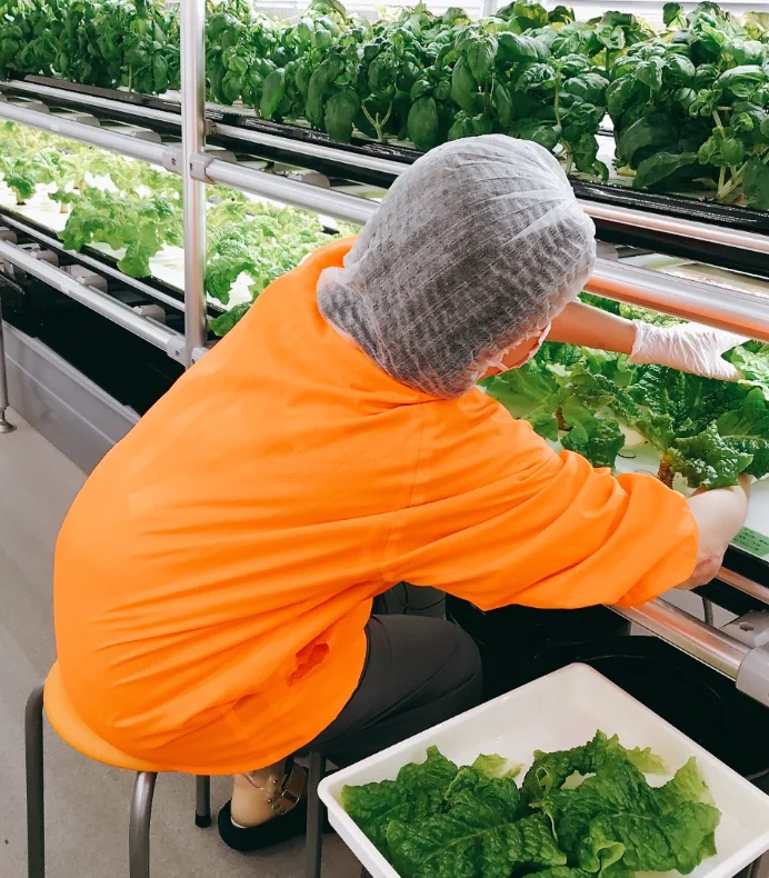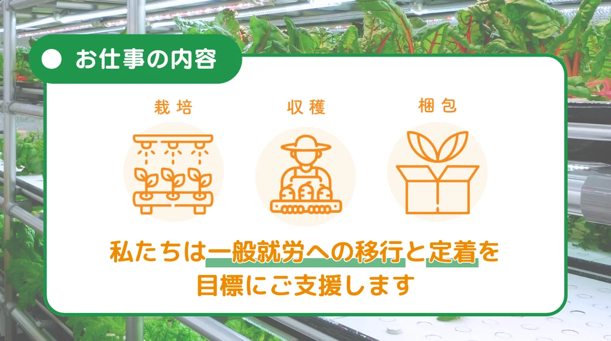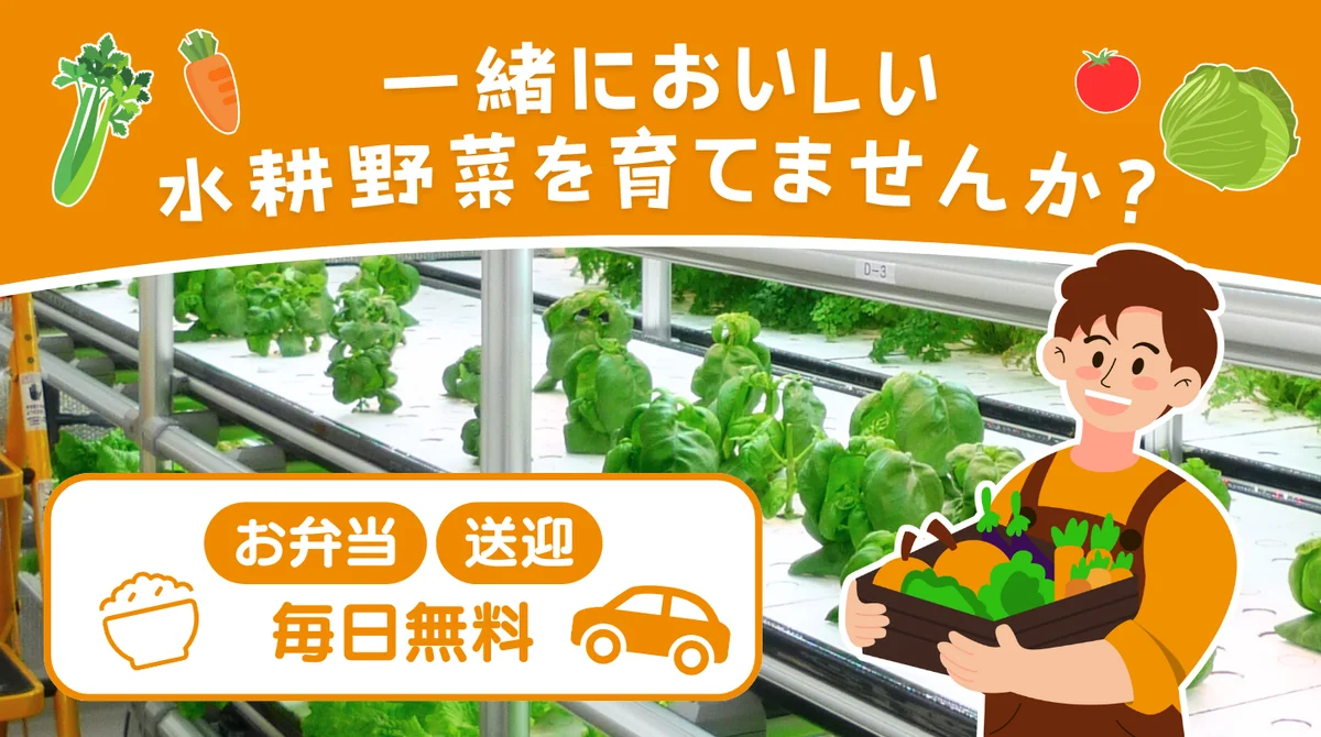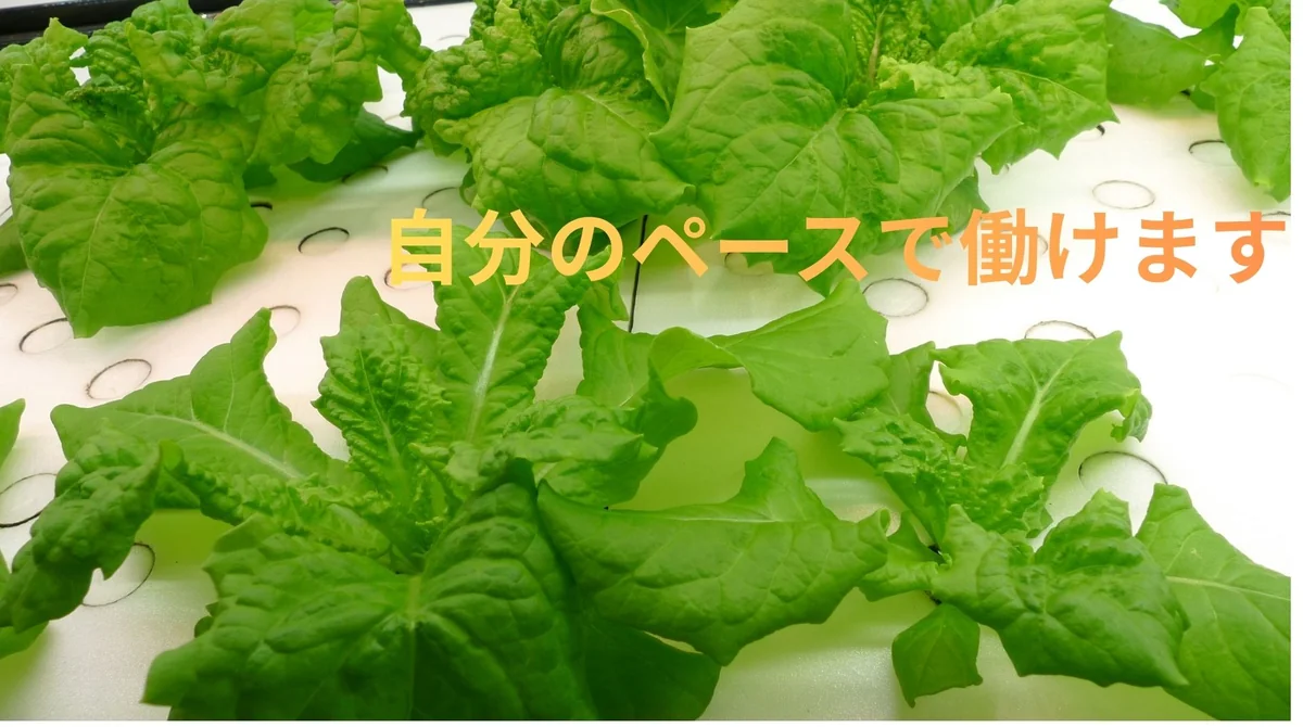 天候に左右されない水耕栽培で野菜を種から育成・収穫。室内なので夏も冬も快適温度で作業ができます。昼食無料、送迎無料です。