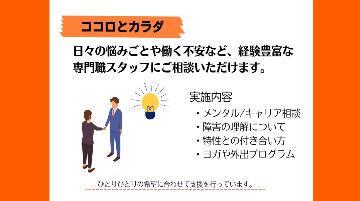 ひとりひとりの希望や状態に合わせて、就職に向けた支援計画を立てることができます。