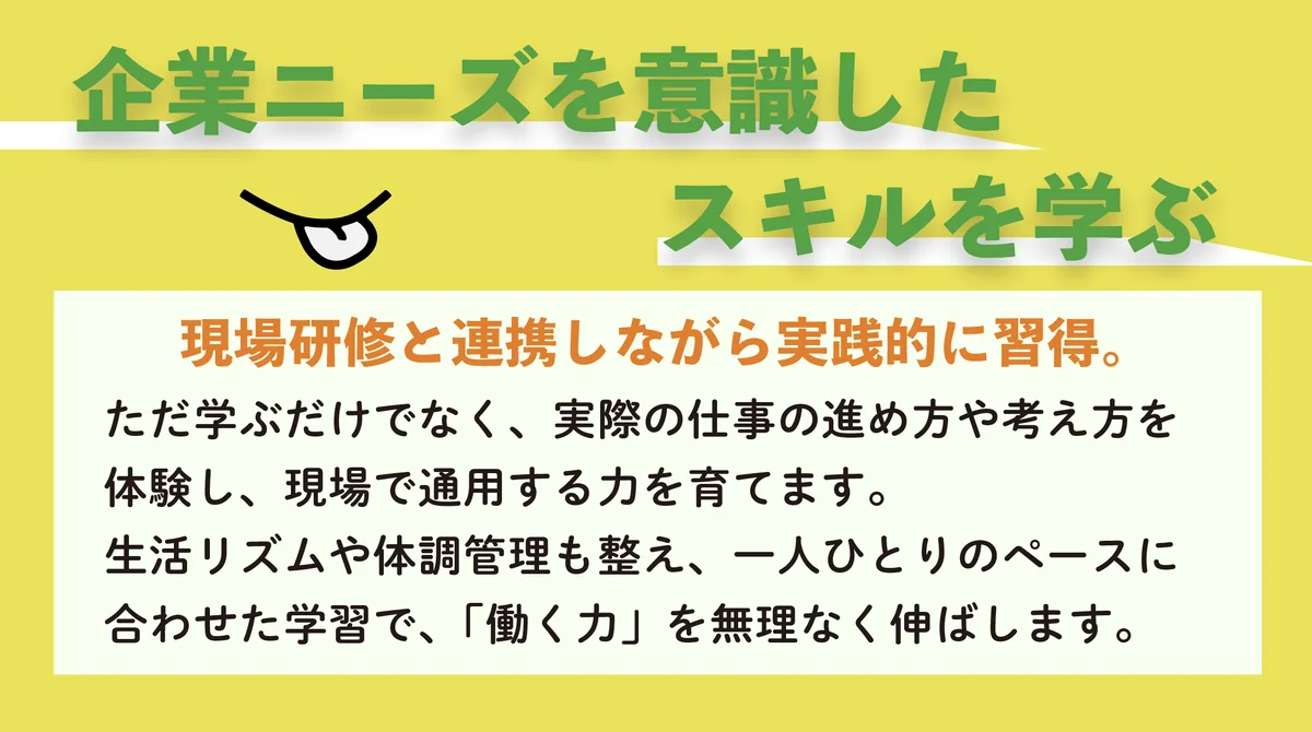 企業へ就職するために生活リズムを整えながら、障害や病気に関する困りごとへの対処方法や働くためのスキルを身につけることができます。