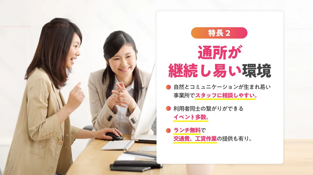 ひとりひとりの希望や特性に合った職場へ就職するために、スタッフによるサポートを受けながら就職活動を行うことができます。