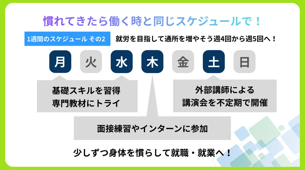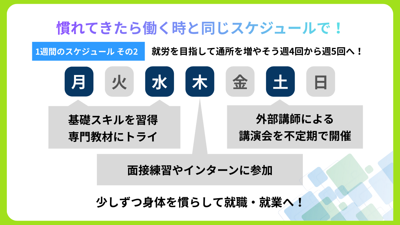 企業へ就職するために生活リズムを整えながら、障害や病気に関する困りごとへの対処方法や働くためのスキルを身につけることができます。