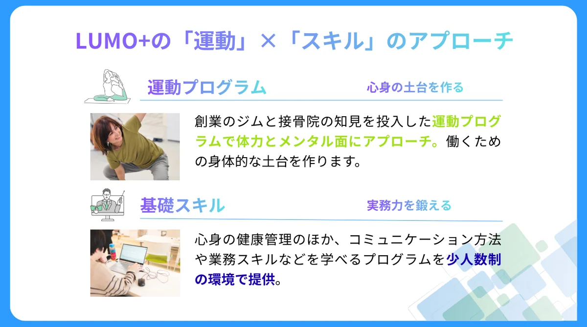 LUMO+(ルーモプラス)は、単に就職だけを目指すのではなく、就職した後も長く活躍できる「力のある人材」を目指します🌱 「体力」と「メンタル」を独自の運動プログラムで調え、その上にビジネス・コミュニケーション・パソコンなどの「仕事スキル」を積み上げるアプローチを行います📚 運動プログラムは、運動が苦手な方でも行えるストレッチや軽いメニューが中心です‼ 身体のコンディションが安定すると、メンタルも安定し、新しいスキルの習得スピードも加速します🚀 LUMO+で、自分本来の力を発揮するための「身体的な土台」を作りませんか? 在宅訓練も可能です💻 詳細は、事業所まで‼ 気負わずお気軽にご相談ください💛