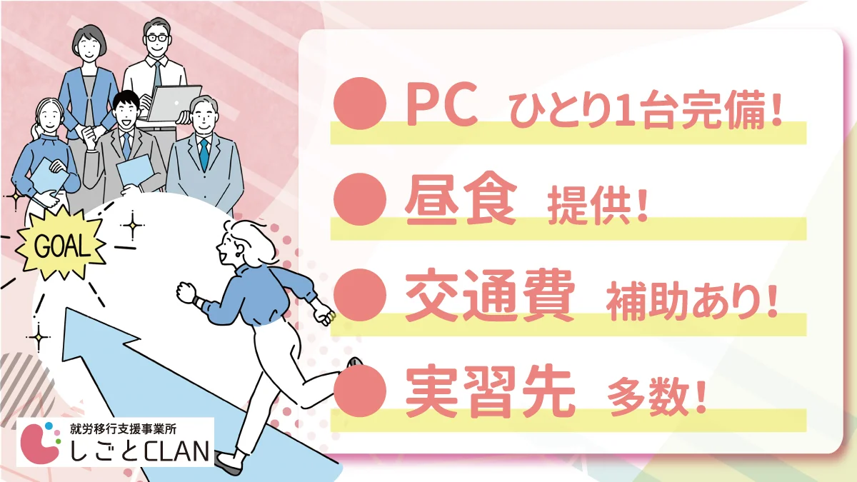 運営母体となる株式会社CLANでは、多くの施設を運営しております。 生活介護施設 14カ所 高齢者施設 28カ所 放課後デイ 6カ所 就労継続B型 1カ所 しごとCLAN梅田ではその規模を活かし、グループ内での実習を手軽に受けることが可能です。 「いきなり他社での企業実習は不安、、、」など 事業所内での訓練だけではなく、まずは気軽に実際に働いてみて新たな自分を発見してみませんか?