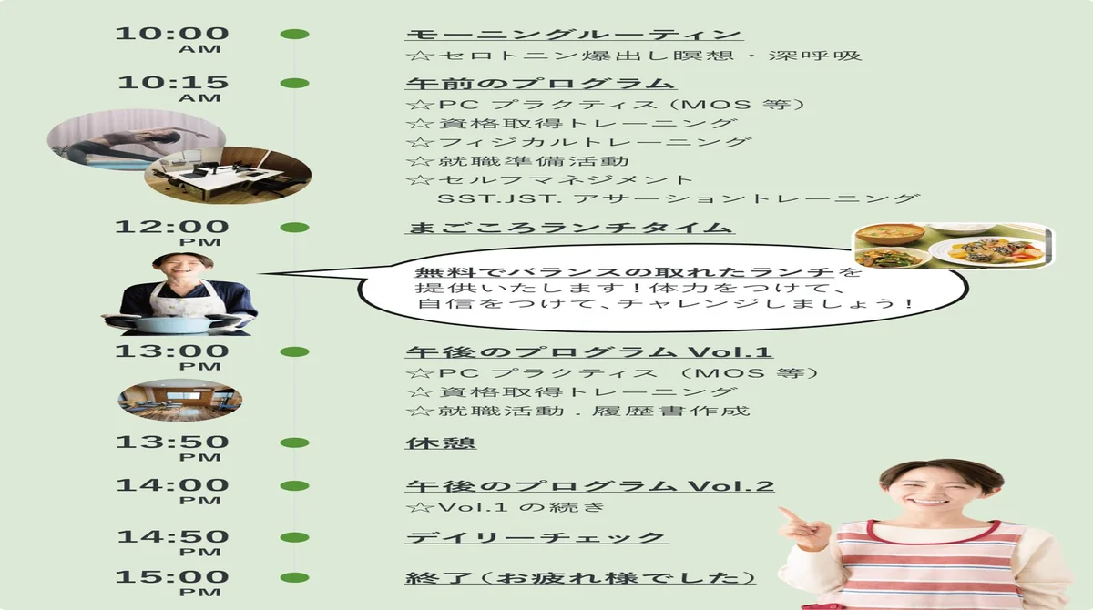 企業へ就職するために生活リズムを整えながら、障害や病気に関する困りごとへの対処方法や働くためのスキルを身につけることができます。