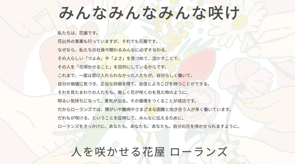 障がいや難病と向き合う上で、 働く選択肢が少ないと感じたことはありませんか? 「これが好き」という気持ちを持って働ける場所はありますか? ローランズは、花を通じて 「好きを仕事にする」 という新しい選択肢を広げます。 花や植物に関わる学びを通じて、 自分らしい咲き方(働き方)を一緒に発見しましょう。 私たちは、一歩踏み出すあなたを応援します。