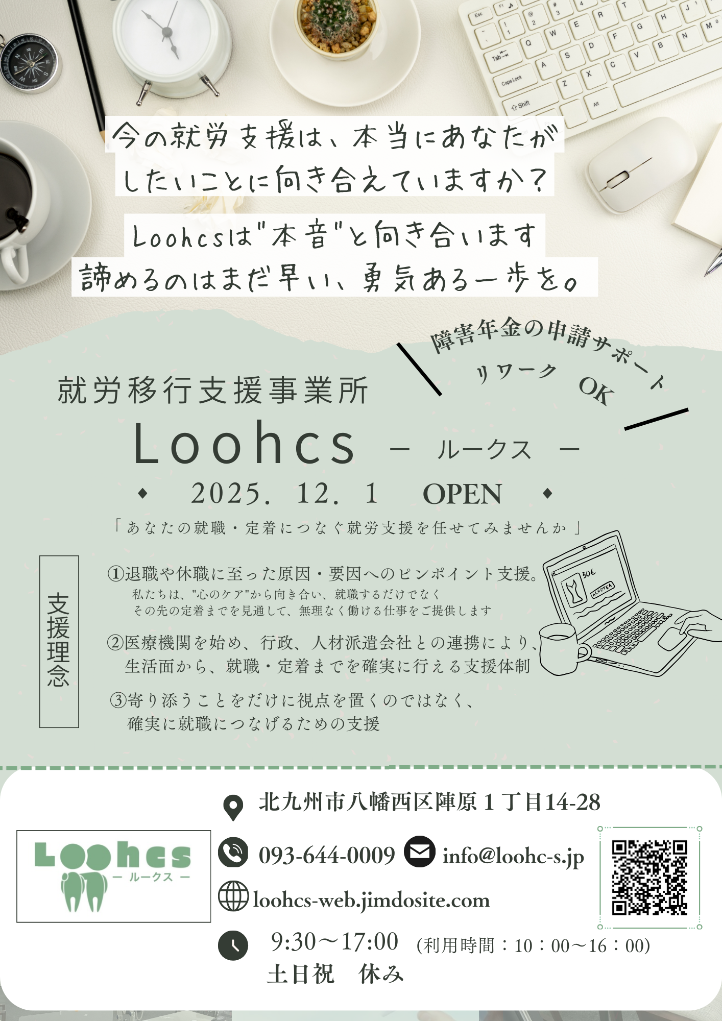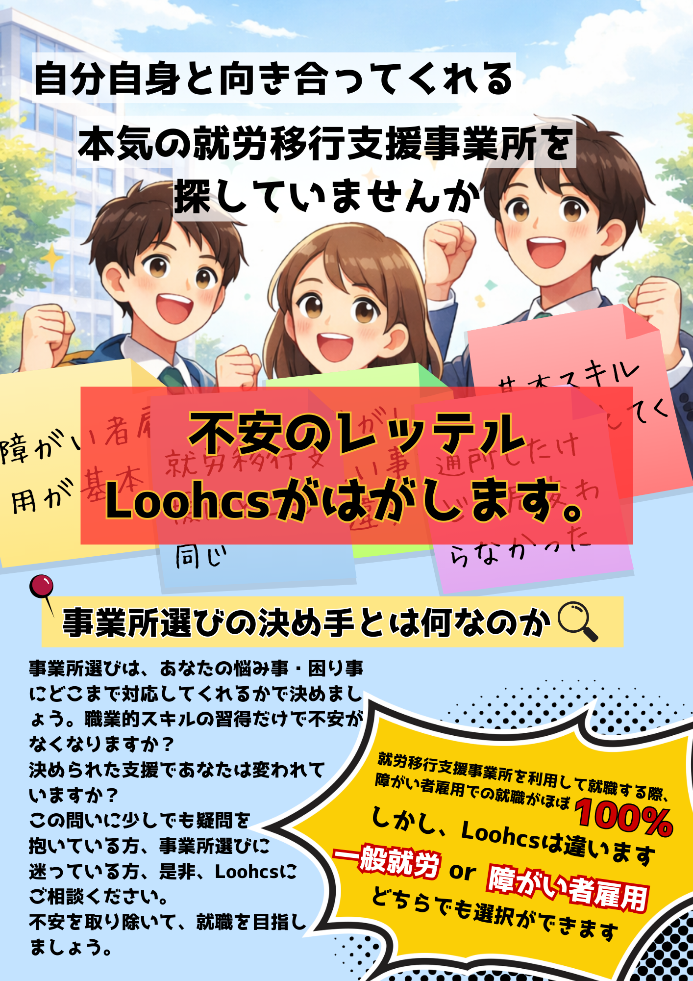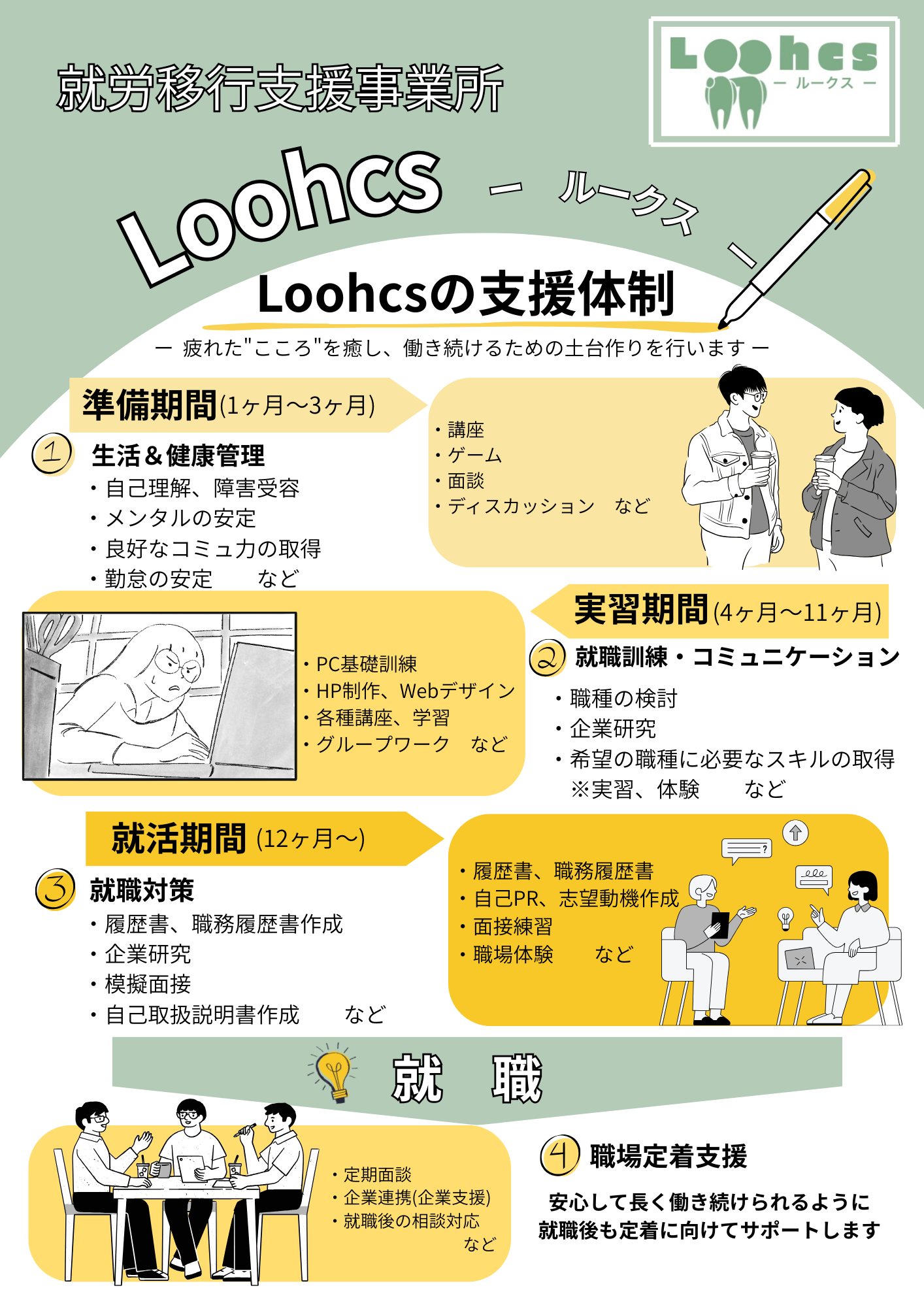 就労移行支援事業所Loohcsは、心の土台づくりを大切にし、個別カリキュラムによる基本スキルからWebデザイン、IT、資格取得支援まで行います。就職から職場定着まで一貫してサポートする事業所です。