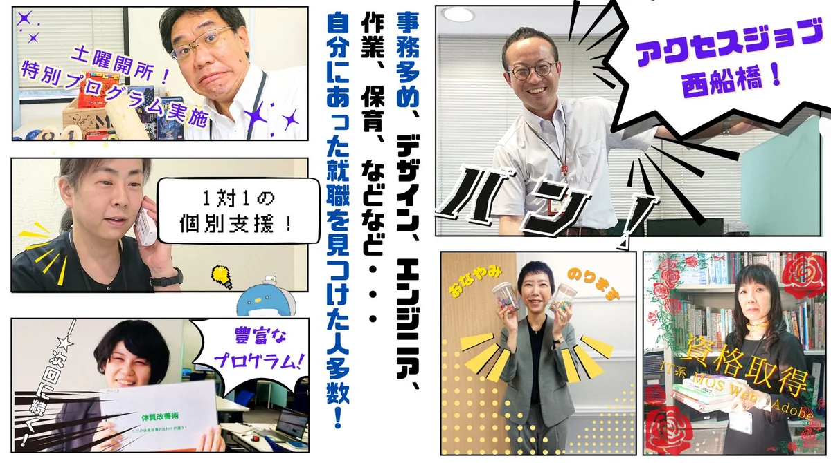 【アクセス】 西船橋駅徒歩5分。 【事業所の特徴】 公的機関~外資系まで幅広い就職実績。入社後の定着支援最大3年半あり。丁寧な個別面談で、あなたの状況に合わせた個別訓練プログラムをご提案。精神保健福祉士、ジョブコーチほか、福祉業界での経験豊富なスタッフ、一般企業の様々な職種で活躍してきたスタッフが在籍。あなたの「働く」を温かくサポートするプロフェッショナル集団です。 ★事業所の詳細はHPから★ https://www.accessjob.jp/office/nishifunabashi/