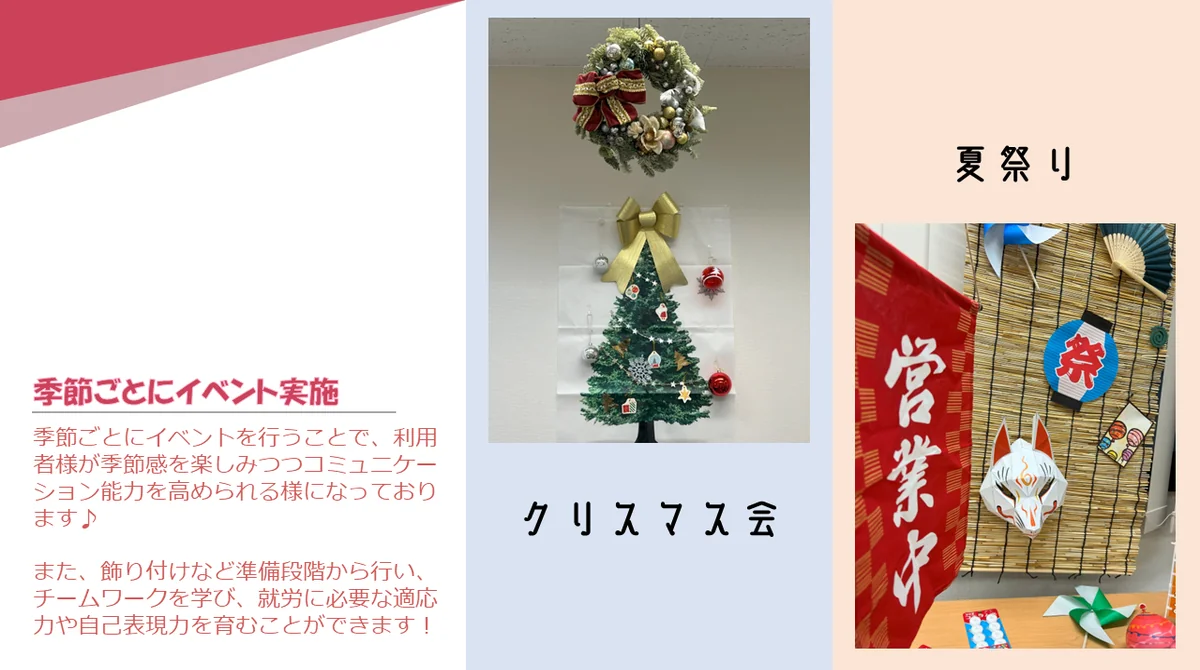 当事業所は、知的・精神・身体の3障害に対応しており、一律のプログラムではなく、個々のニーズや状況に応じた柔軟なサポートを提供しています。 職員は福祉、IT、教育など多様な分野で豊富な経験を持ち、その専門性を活かして利用者一人ひとりに最適な就職支援を行っております。 見学・体験やご不明点等ございましたらお気軽にお問い合わせください。