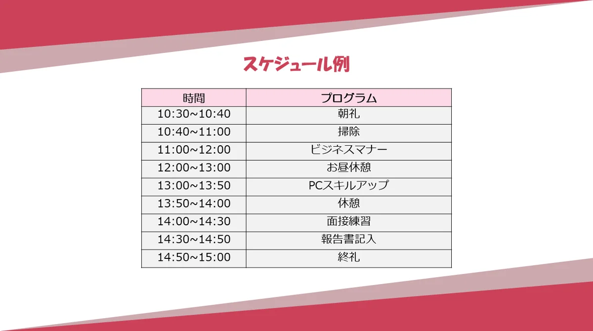 企業へ就職するために生活リズムを整えながら、障害や病気に関する困りごとへの対処方法や働くためのスキルを身につけることができます。