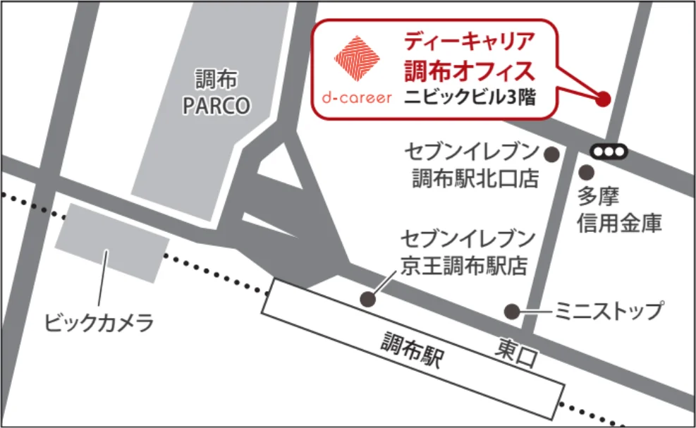 ディーキャリア調布オフィスは、東京都調布市の調布駅から徒歩2分に位置する「就労移行支援事業所」です😊 発達障害・精神疾患がある方が「自己理解」を通して「自分らしく働き続けられる」ようになるための就職訓練を行っております✨ やりがいを感じられる仕事探し]×[あなたらしい働き方探し]を私たちディーキャリア調布オフィスとともに目指しませんか? あなたの「働きづらさ」について、私たちディーキャリア調布オフィスにぜひ聞かせてください! 無料体験・相談会も受け付けております。 まずはお気軽にお問い合わせください(*'▽')